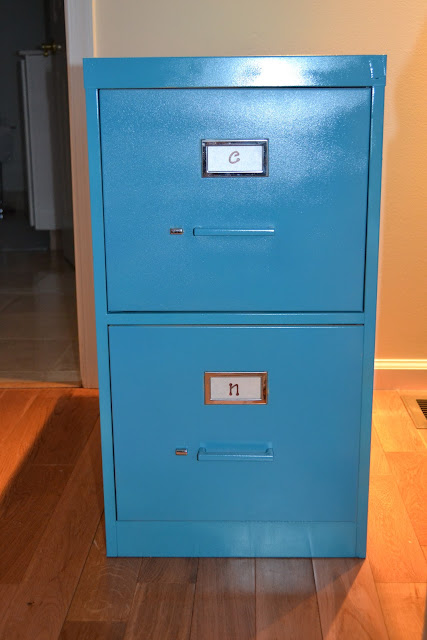 I first took out the drawers, then wiped down the cabinet with a damp cloth. I added tape around the hardware and only did the front of the drawers. After the cabinet was finished and dry I added labels on each drawer using scrapbook paper and an "e" for "Emily" and an "n" for "Nick" to keep our files organized. I love the final project!